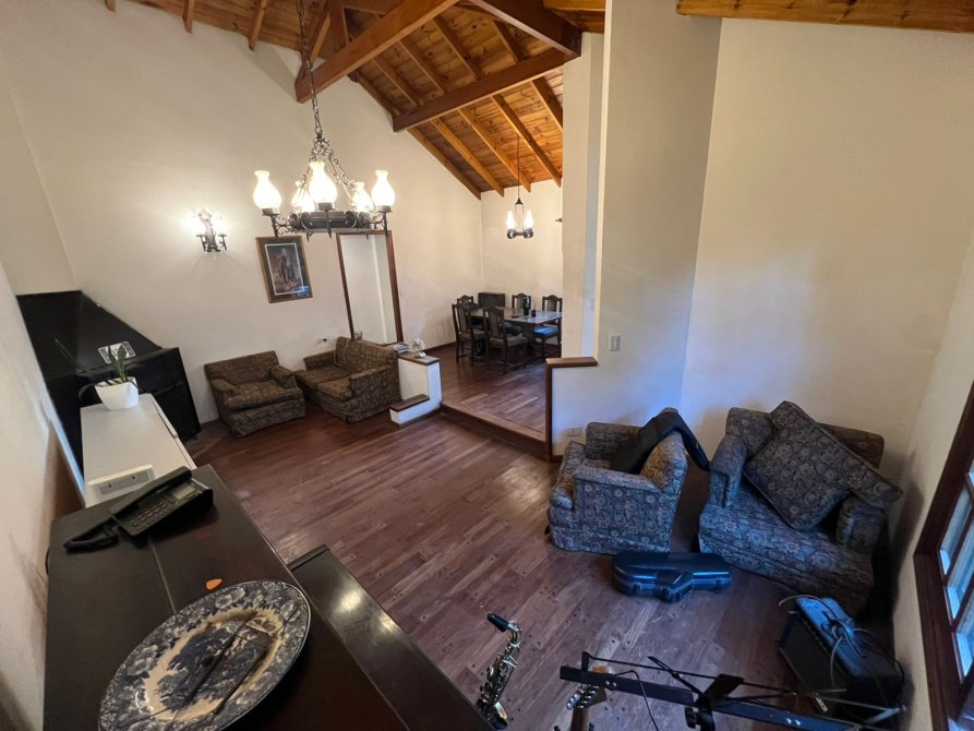 -Living comedor / sala de estar con desnivel con hogar, pisos tarugados de madera